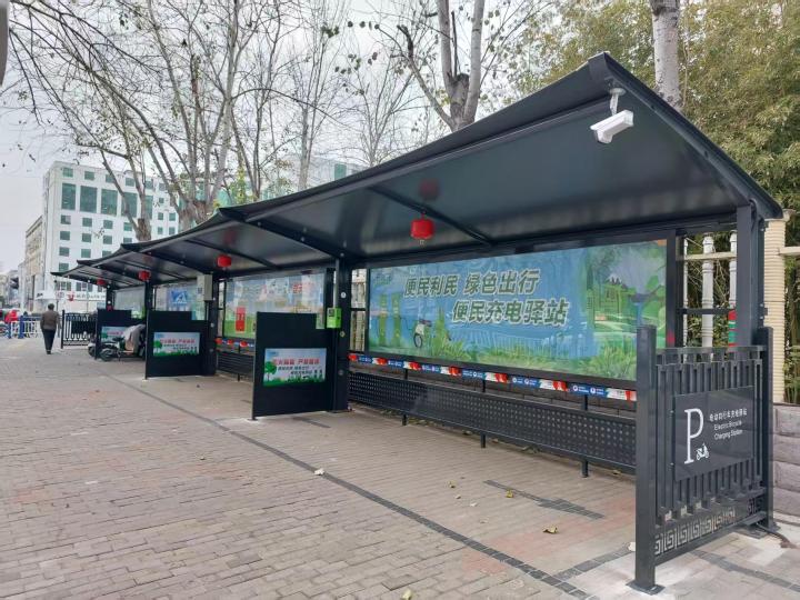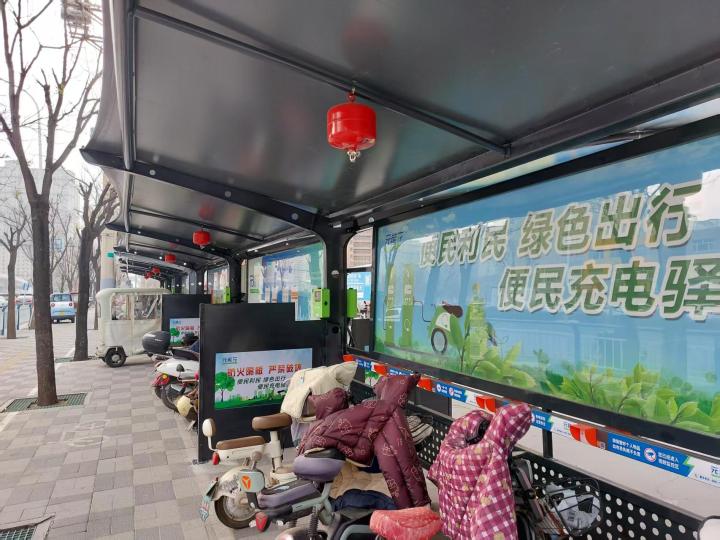 智能管理,提升服务体验。充电驿站全部采用智能化系统,实现智能充电与远程监控相结合,让充电服务更便捷、管理更高效。充电主机具备过载保护、短路保护、自动计费等功能,市民通过刷卡、扫码等多种支付方式即可轻松充电。充电驿站配备全时段远程视频监控系统,可实现机房对各站点的实时状态监测与录像存储。此外,驿站还配备了夜间自动照明灯箱,既方便市民夜间使用,也成为城市一道亮丽的风景线。