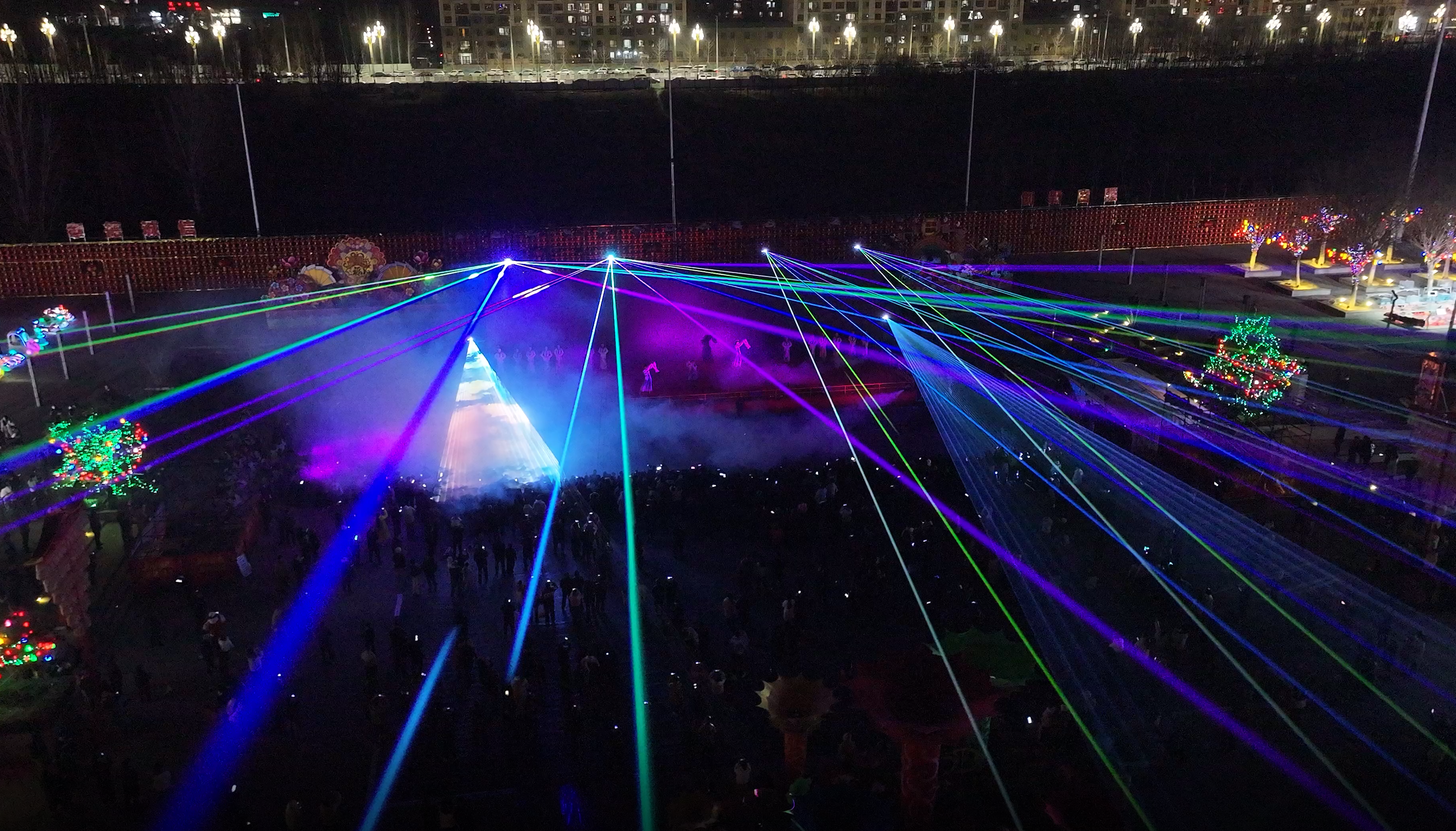 灯会最亮眼的是激光秀。六束翠绿激光劈开黑暗,如刀刃划破夜空。光柱在烟雾中成形,又骤然斜飞、折角、拖出光的残影。红潮横扫,蓝粒升空炸成碎钻,紫光乍现,而后无声熄灭。黑暗落下的三秒里,光的轨迹仍在视网膜上燃烧!加上吉祥龙凤灯一冲飞天,似有遨游九天之势,引得现场观众欢呼声、呐喊声、掌声炸裂全场!