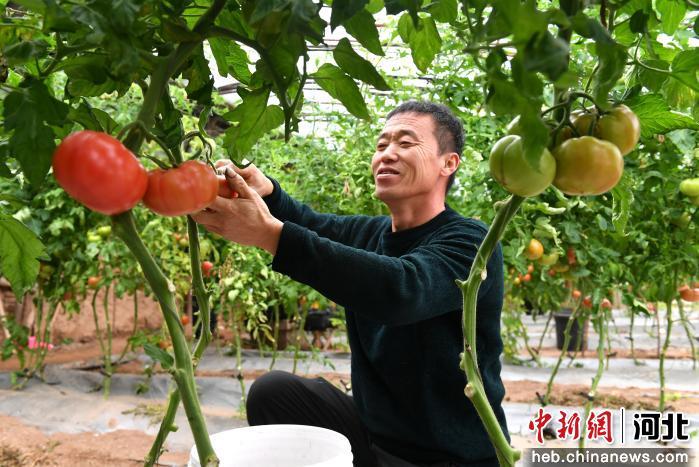 河北省阜城县蒋坊乡北伊村大棚内,农户正在采摘西红柿。 崔贤飞 摄