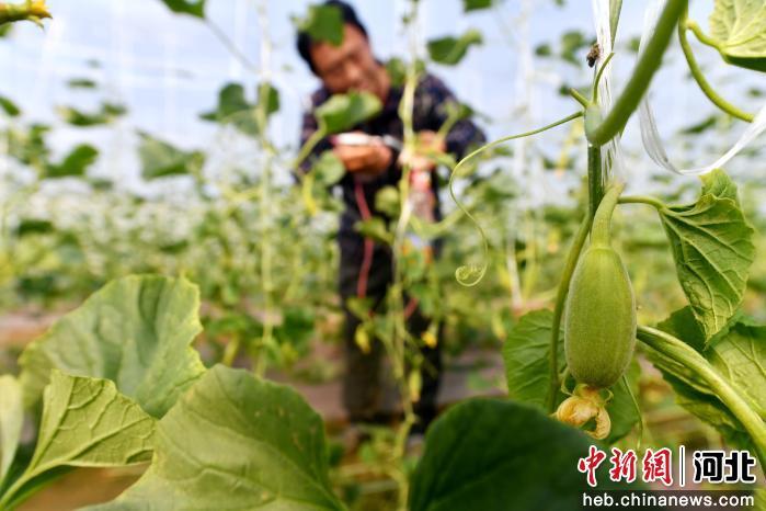 河北省阜城县漫河镇倪庄村大棚内,瓜农正在给甜瓜授粉。 崔贤飞 摄