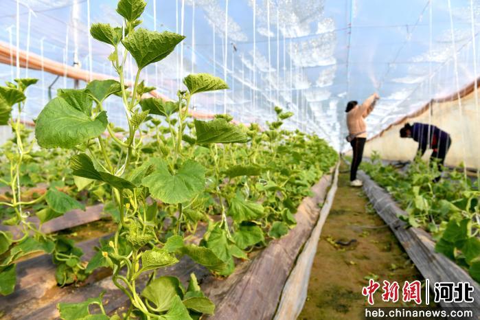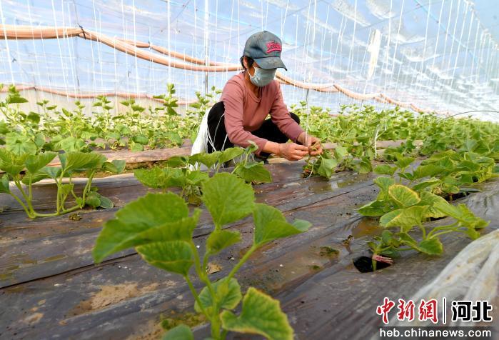 河北省阜城县漫河镇倪庄村大棚内,农户忙着为甜瓜苗吊秧。 崔贤飞 摄