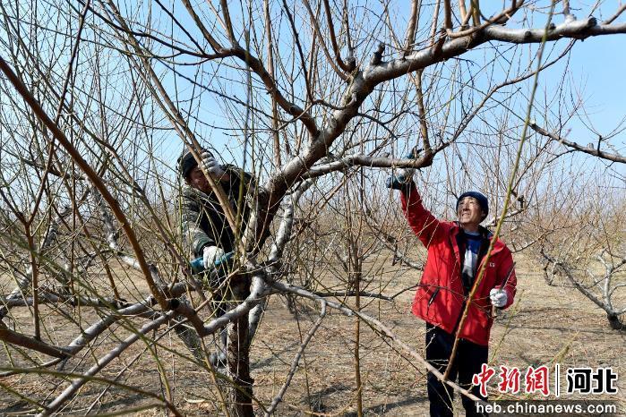 河北省阜城县漫河镇漫河村桃园内,农户正在剪枝。 崔贤飞 摄