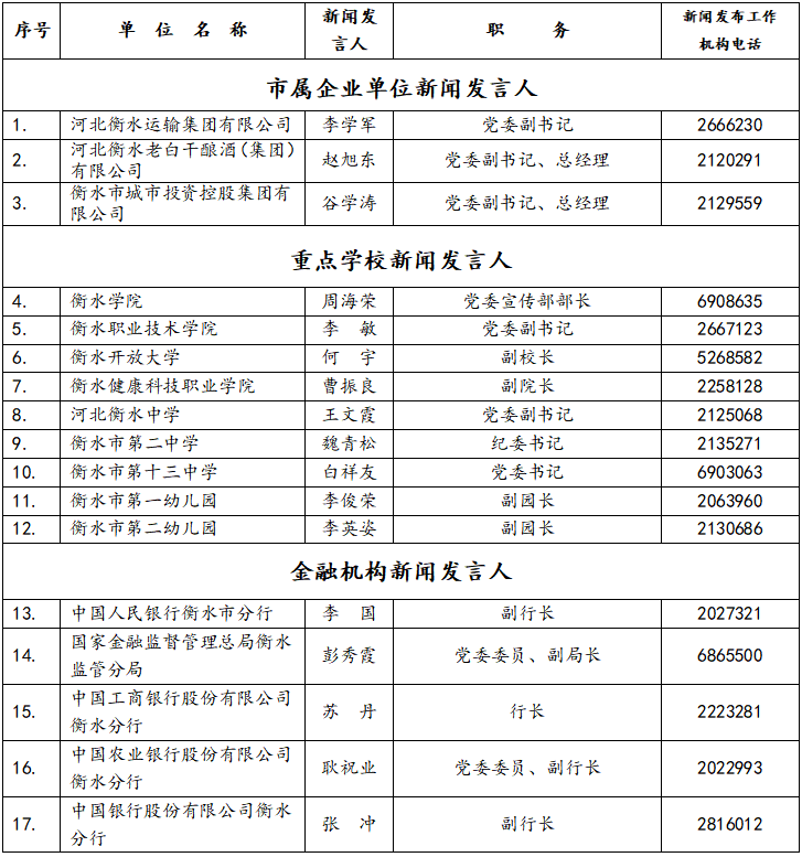衡水 重点学校 金融机构 新闻发言人