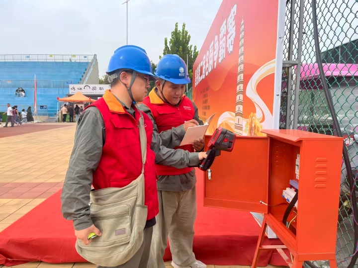 近日,在衡水市景县文体中心体育场,国网景县供电公司工作人员一早便对场内配电箱、临时用电设施开展巡视测温,为国庆假期开展的“景县2025年国庆中秋美食推广季”等系列文旅活动提供可靠电力保障。