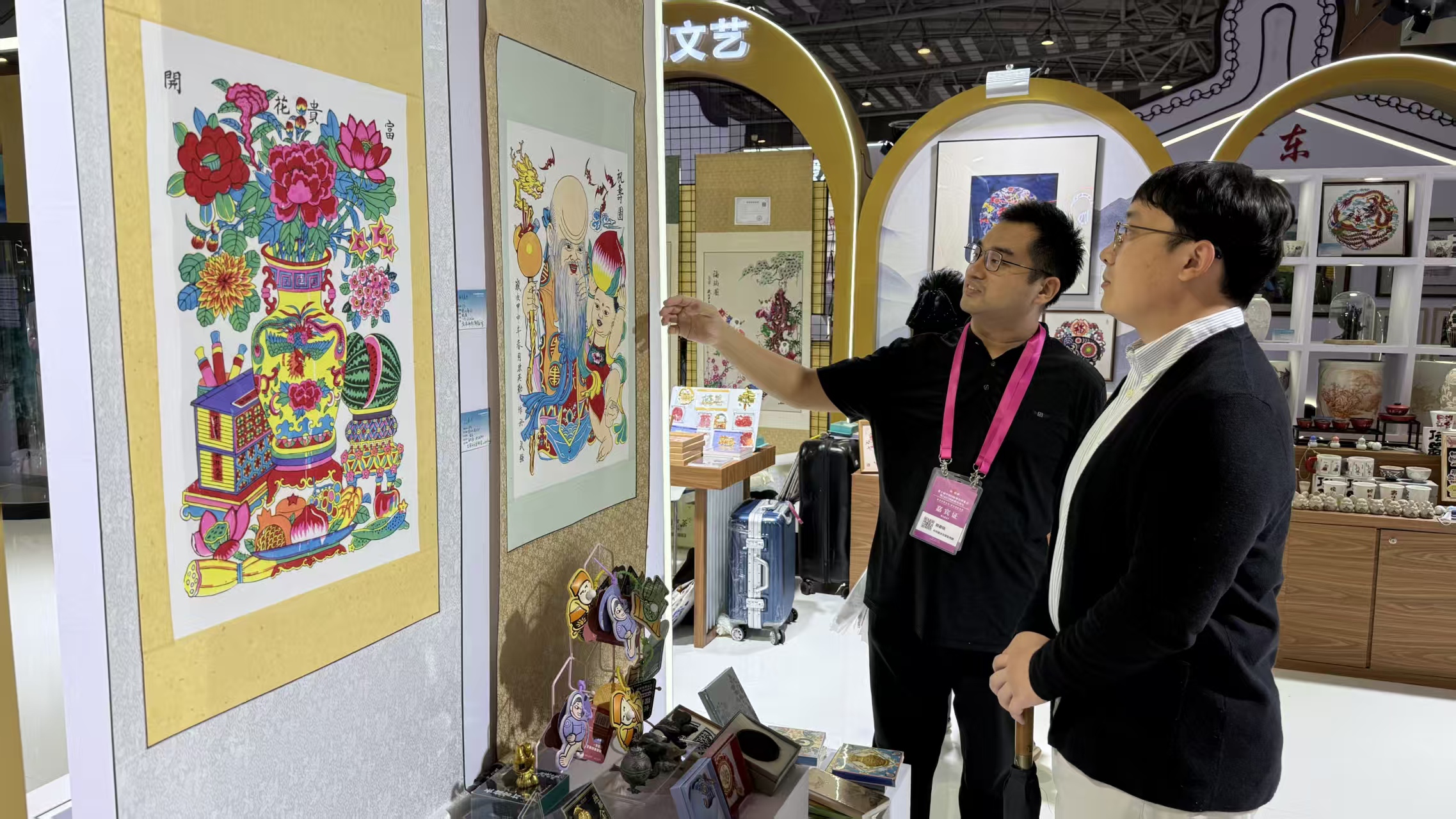 活动期间,衡水市展位前人头攒动。国家级非物质文化遗产武强年画占据河北展区“C位”,成为关注焦点。“武强木版年画有着悠久的历史,始于宋元时期……”“作品《连年有余》精心刻画出活泼可爱、怀抱鲤鱼的白胖娃娃形象,画面中的“莲”与“连”同音,而“鱼”和“余”谐音,象征年年富余、生活丰裕;《富贵花开》以武强年画传统代表作品大花瓶为题材,结合现代年画的表现手法,寓意“诗礼传家”“健康长寿”“多子多福”等,莲花及鲜藕亦有祝颂连生贵子之意”……在衡水市委宣传部相关人员的讲解带领下,与会嘉宾和参观群众更加详细地了解了武强年画的历史渊源、制作工艺和艺术价值,赞叹年画中有故事、有灵魂,小小一张年画,可以讲出大道理、反映大民生。