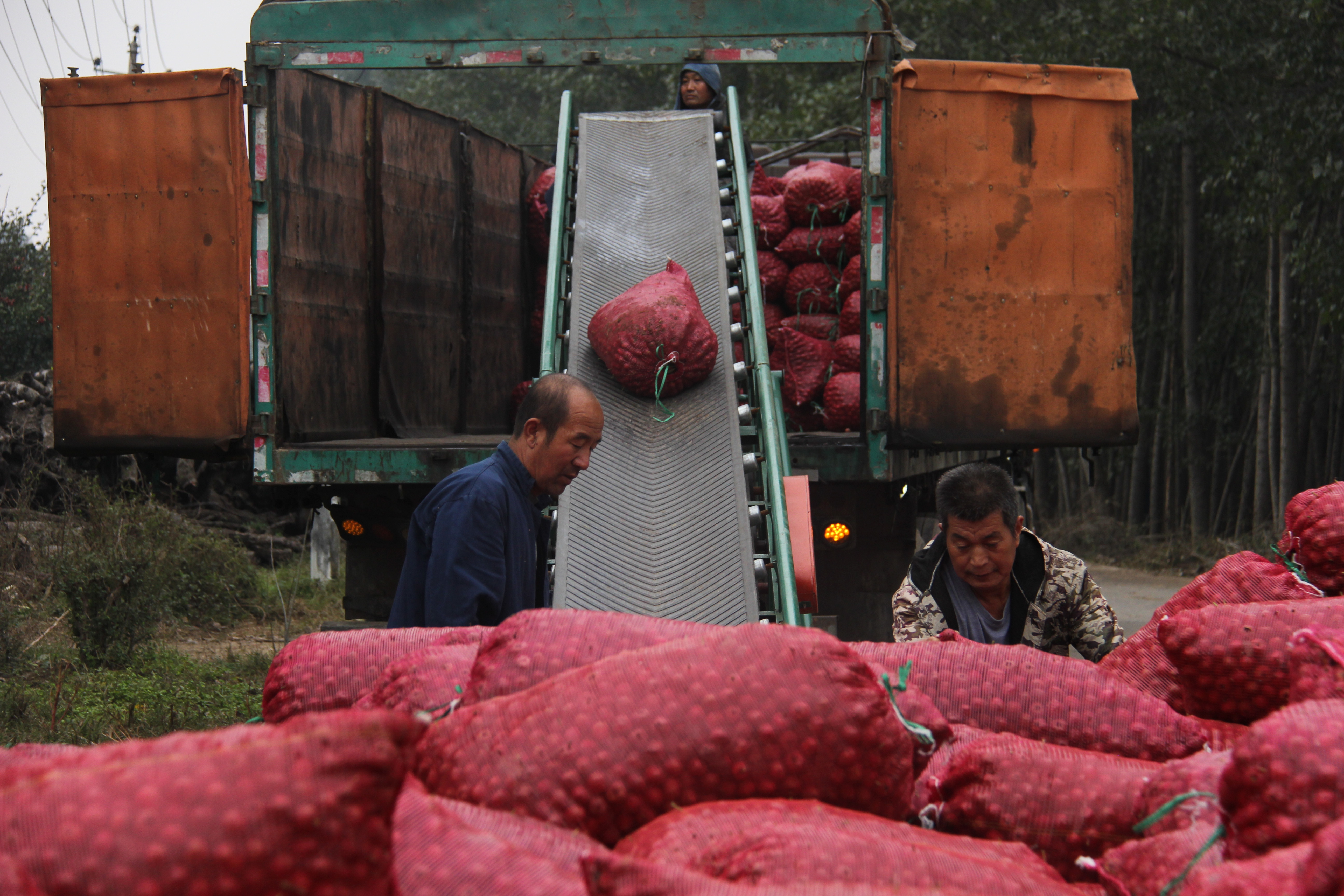 在山楂采摘季里,山楂林便成了“就业磁场”。每天都有近百位周边村民前来帮忙采摘,熟手工人日均收入能达到100元。这份“枝头摘金”的活计,让百余名村民实现家门口就业,红果映照的笑脸里,藏着乡村振兴最鲜活的注脚。村里的小路边,一袋袋山楂早已码成小山,每袋都鼓胀得仿佛要撑破缝线,露出里面浑圆的山楂果实。村民们用传送带将一袋袋山楂装进货车,“老张,把南边那排麻袋往中间推推!”大家忙碌的身影和满袋红果相映成趣,一袋袋山楂在肩头传递的节奏,与远处果园里此起彼伏的采收声遥相呼应。