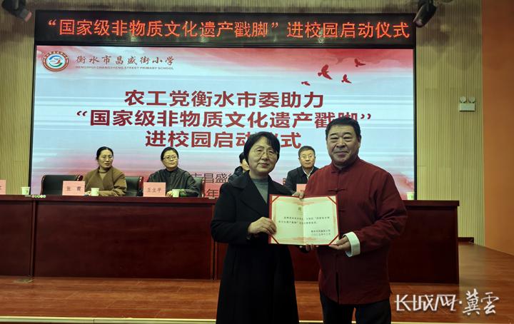 启动仪式上,国家级非物质文化遗产戳脚代表性传承人宋君杰为衡水市昌盛街小学颁发“国家级非物质文化遗产戳脚武术传承基地”牌匾,衡水市昌盛街小学党支部书记、校长张晓红为宋君杰颁发特聘教练员证书。活动中,宋君杰还向学校捐赠了《校园课程读本·戳脚》《非遗戳脚·金刚锤》《非遗戳脚·六合根》三部个人专著,助力校本课程开发。