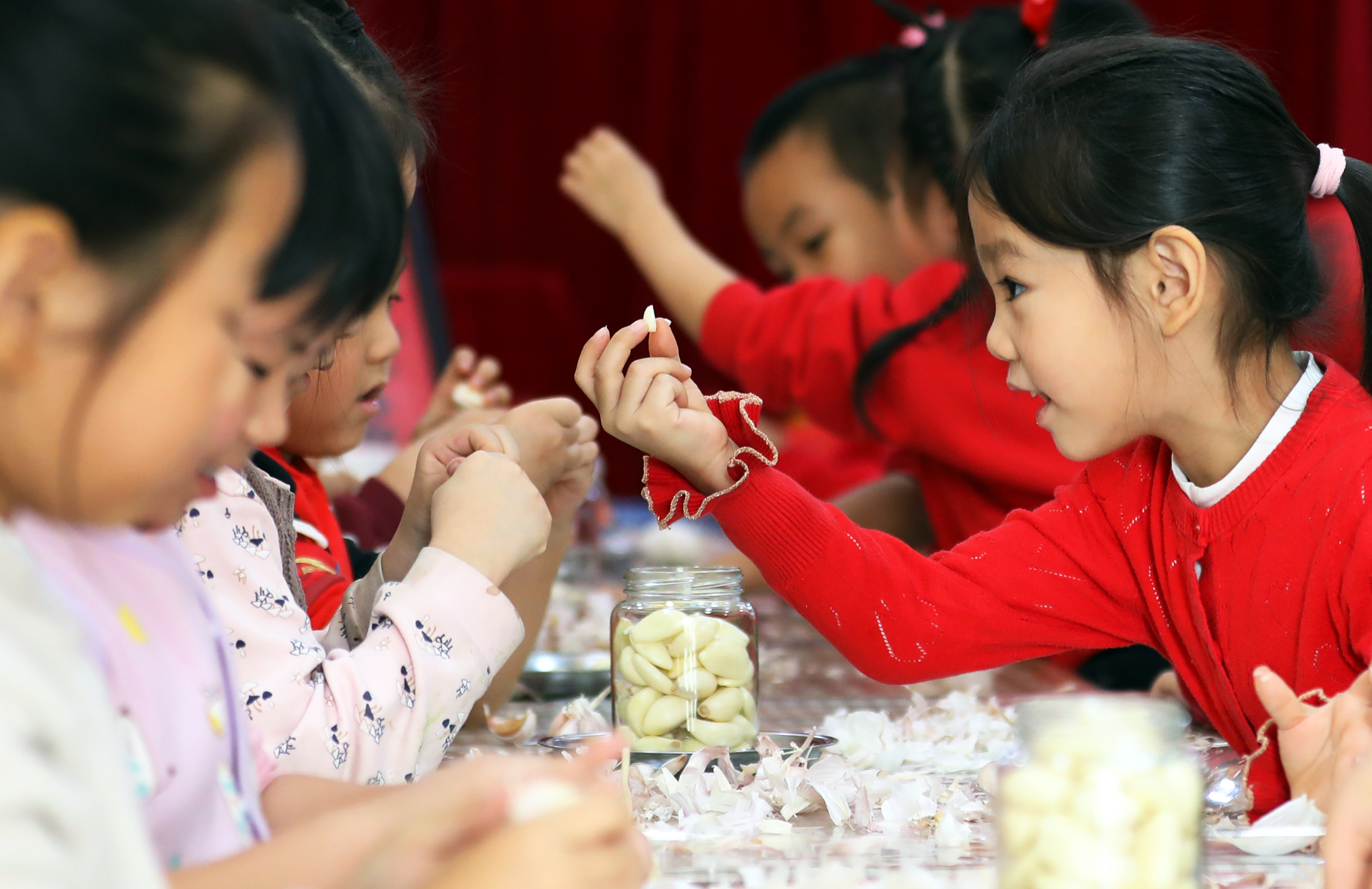 动手实践环节是活动焦点,腌腊八蒜、熬制腊八粥两项活动有序开展。腌蒜现场,教师备好食材并演示剥蒜技巧,孩子们分组尝试,互帮互助、耐心操作。他们将蒜瓣放入罐中,由教师协助加醋、封盖、贴标签,教师同步讲解腌蒜寓意及蒜瓣变色原理,引导孩子们观察记录、静待惊喜。