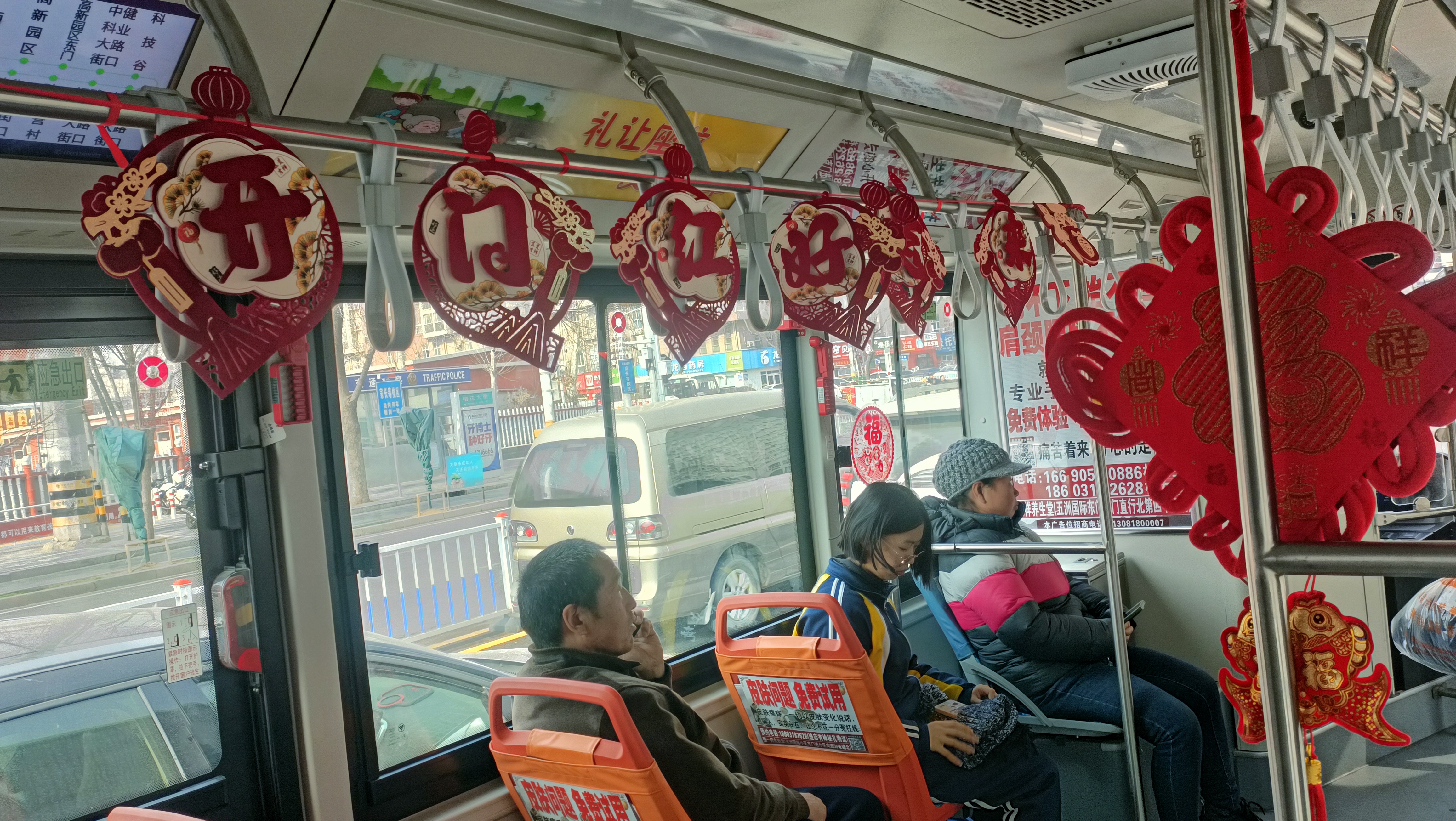 步入公交车,新春气息扑面而来。车厢内年味十足,火红的“福”字悬于车顶,车窗贴满吉祥窗花,“新年快乐”拉花与福字交相辉映,中国结和马年剪纸点缀其中。“车厢布置得像家一样温馨,在乘车时感受到浓厚的节日氛围。”乘客刘佳说。