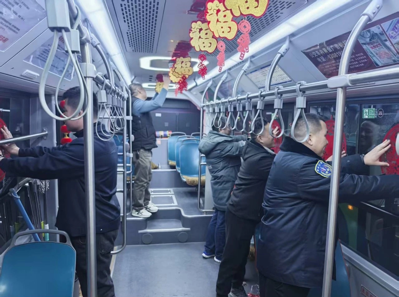 本次主题车厢装饰以中国红为主色调,巧妙融入马年生肖元素,融合福字、窗花、中国结等经典年俗符号,既凸显传统年味,又传递美好期许。衡水公交集团利用晚间收车后时间为公交车换新装。工作人员精心布局,用红灯笼、中国结、“福”字拉花和马年剪纸窗花进行装饰,从车顶到车窗,从扶手到角落,每处细节都饱含美好祝愿,只为向乘客传递新春祝福。