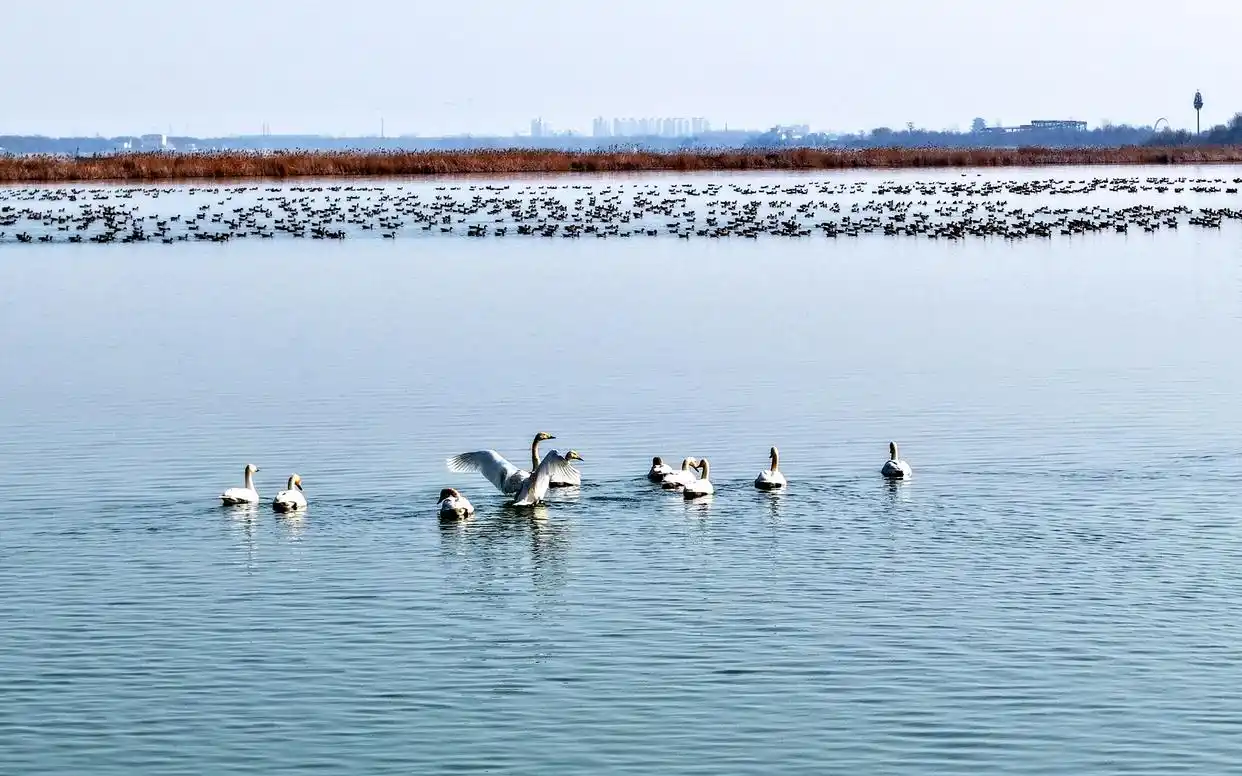 在碧波荡漾的水面上,近百只白天鹅结伴栖息。它们或曲颈低头梳理羽翼,或猛地扎入水中觅食。偶有几只振翅凌空,身姿优雅,洁白的羽毛在阳光下熠熠生辉。