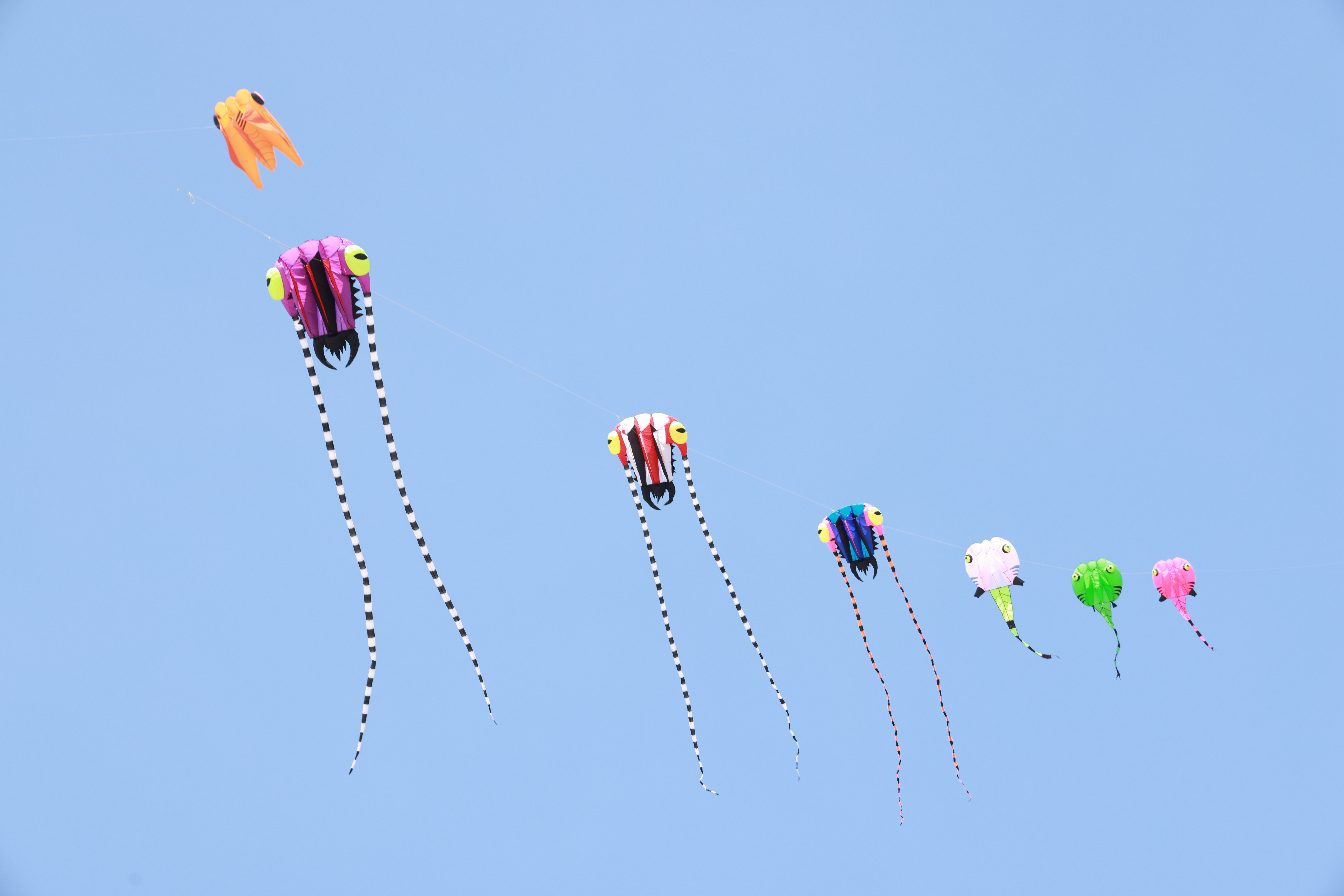 活动现场,潍坊青州马老四风筝放飞队携特制大型软体风筝进行精彩表演。据放飞队负责人马庆章介绍,本次活动共带来130余只各式风筝,种类涵盖板子类、软体类、立体类、长串类等十余种。其中,最大展幅达400平方米的三叶虫软体风筝宛如空中巨鲸,最长的龙串风筝长达260米,引得现场观众惊叹连连。与此同时,各地风筝高手也纷纷亮出绝活:摆动巨爪的章鱼风筝、威风凛凛的老虎风筝、翩若惊鸿的金鱼风筝、展翅翱翔的雄鹰风筝……形态各异的风筝在蓝天白云下争奇斗艳,将大运河畔的天空装点得五彩斑斓。