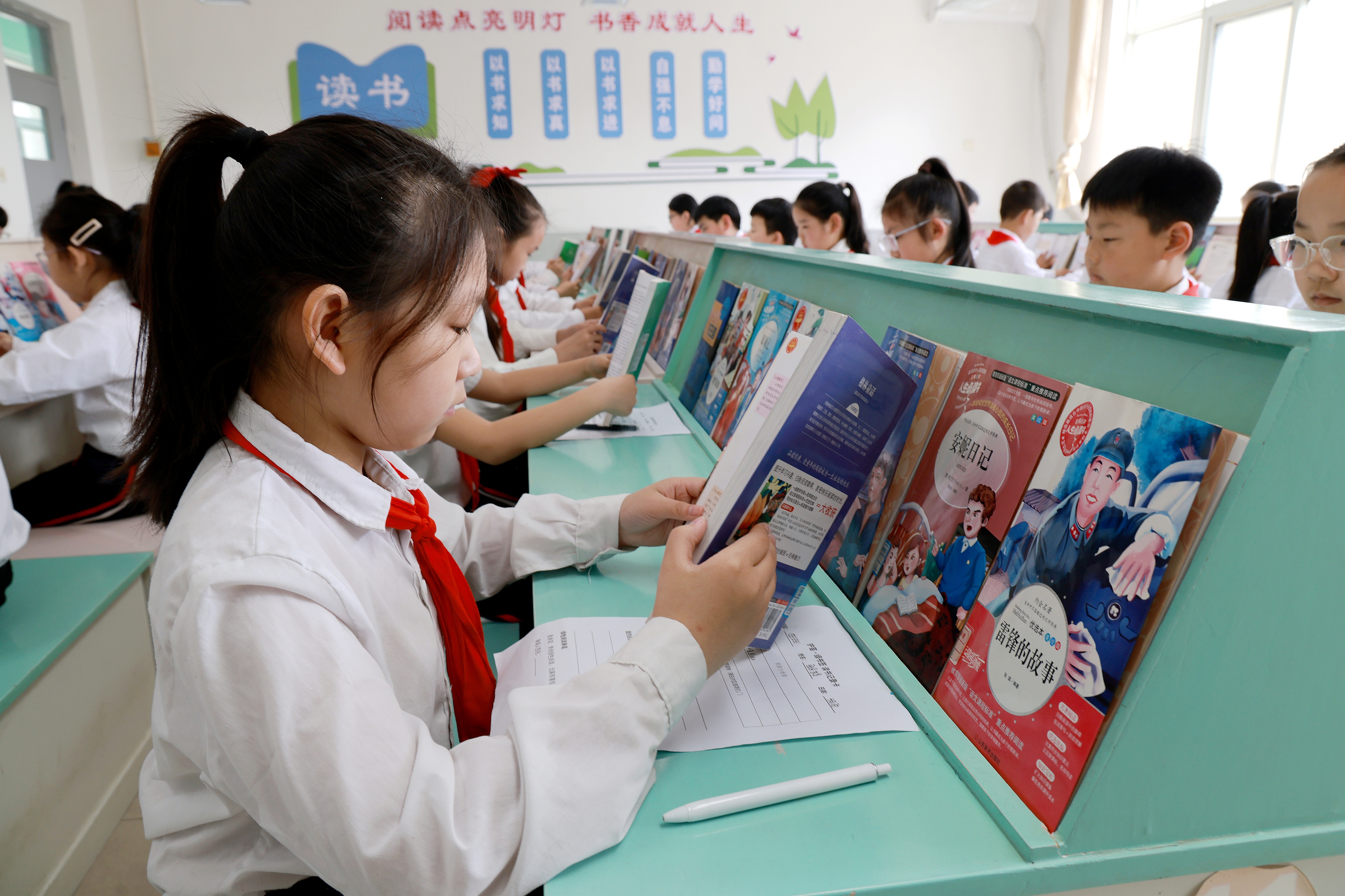 绿书签象征着有生命力的、纯净的文化环境。郑口第三小学学生吴向一展示自己绘图画作品时说,“书籍和网络里有知识也有陷阱,我们要做绿色阅读的践行者,远离有害信息。”学生刘宸睿则表示:“要从自己做起,爱读书、读好书,支持正版、抵制盗版,和同学一起共建书香校园。”