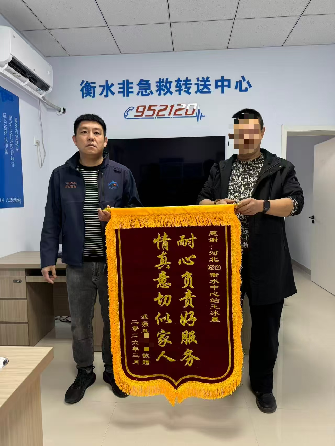 鲜红的锦旗映着真挚的谢意,患者家属紧紧握着工作人员的手连声致谢,温馨感人的一幕定格在衡水市优护送952120医疗照护转送中心,也诉说着一次跨越三地的紧急转运故事。